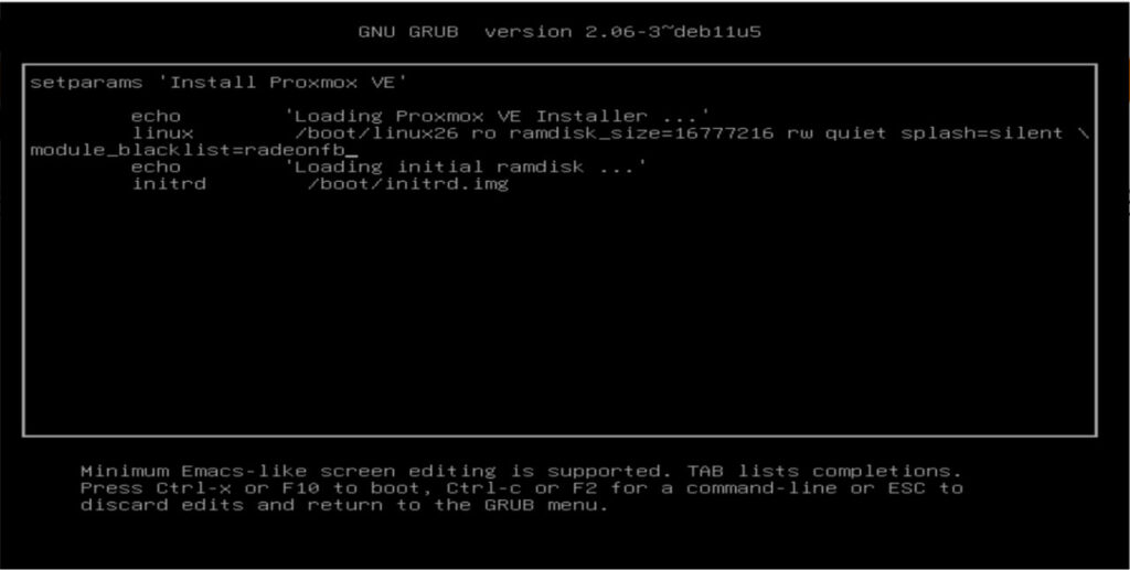 Birden çok çözümü var. Daha eski kernel kullanan bir iso ile boot edebilir ve sonrasında yükseltebilirsiniz. Ya da GRUB ekranında Install Proxmox seçeneği seçiliyken E tuşuna basarak boot config dosyasına erişebilir, linux kodunun sonuna module_blacklist=radeonfb